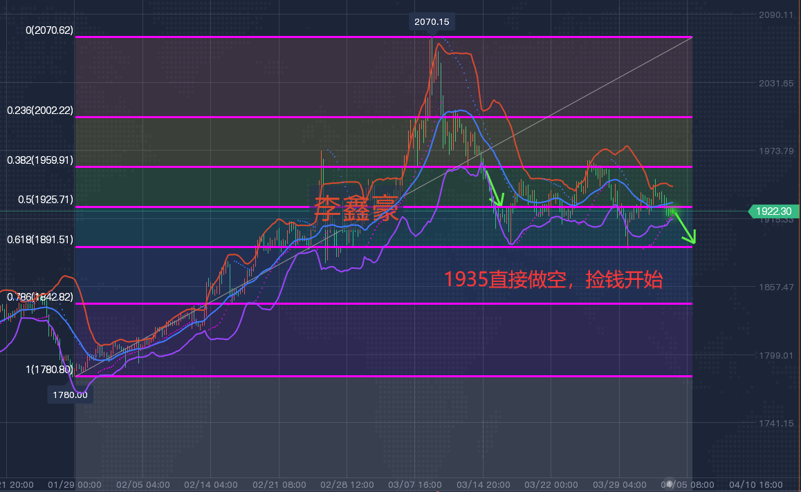 现在黄金市场的多空分水岭已经被我分析到了,日线中轨对金价已经构成压制,接下来黄金还是要继续放空,这一次黄金要跌破1900,不排除1850的可能。指引我们前行的是方向,点位则是我们抵达目标的切入点!黄金受阻于日线中轨1950,这就是放空的依据。黄金暂时保持在区间之中1960-1880的区间。其中1960上方是多头强势区间,下方1880下方是空头强势区间。本周交易关注压力点位1935的压力,价格破位上涨可看周初的延续上涨,上方可见压力位1950一线;反之价格破位1915位置,可见下方1900-1895位置,区间锁定,高抛低吸交易即可,操作上李鑫豪建议黄金周初先看1935位置的压力空即可。