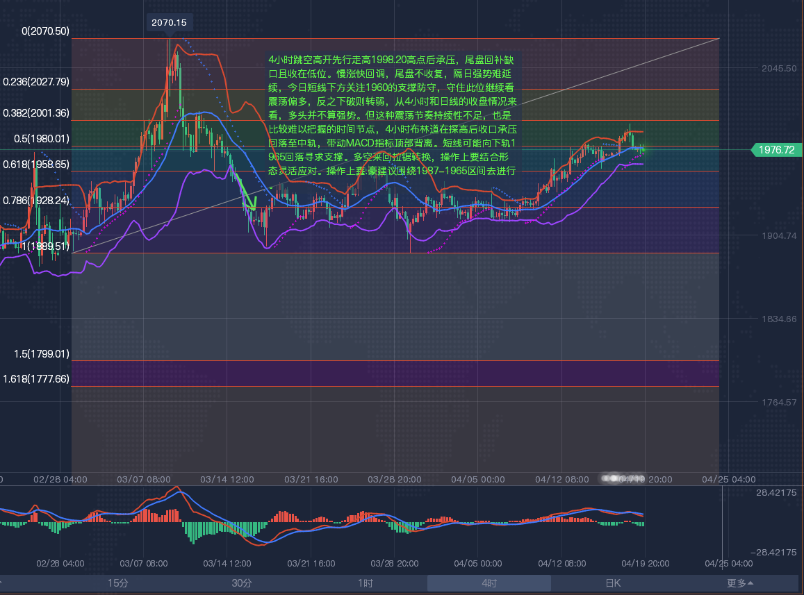 4小时跳空高开先行走高1998.20高点后承压,尾盘回补缺口且收在低位。慢涨快回调,尾盘不收复,隔日强势难延续,今日短线下方关注1960的支撑防守,守住此位继续看震荡偏多,反之下破则转弱,从4小时和日线的收盘情况来看,多头并不算强势。但这种震荡节奏持续性不足,也是比较难以把握的时间节点,4小时布林道在探高后收口承压回落至中轨,带动MACD指标顶部背离。短线可能向下轨1965回落寻求支撑。多空来回拉锯转换,操作上要结合形态灵活应对。操作上鑫.豪建议围绕1987-1965区间去进行。