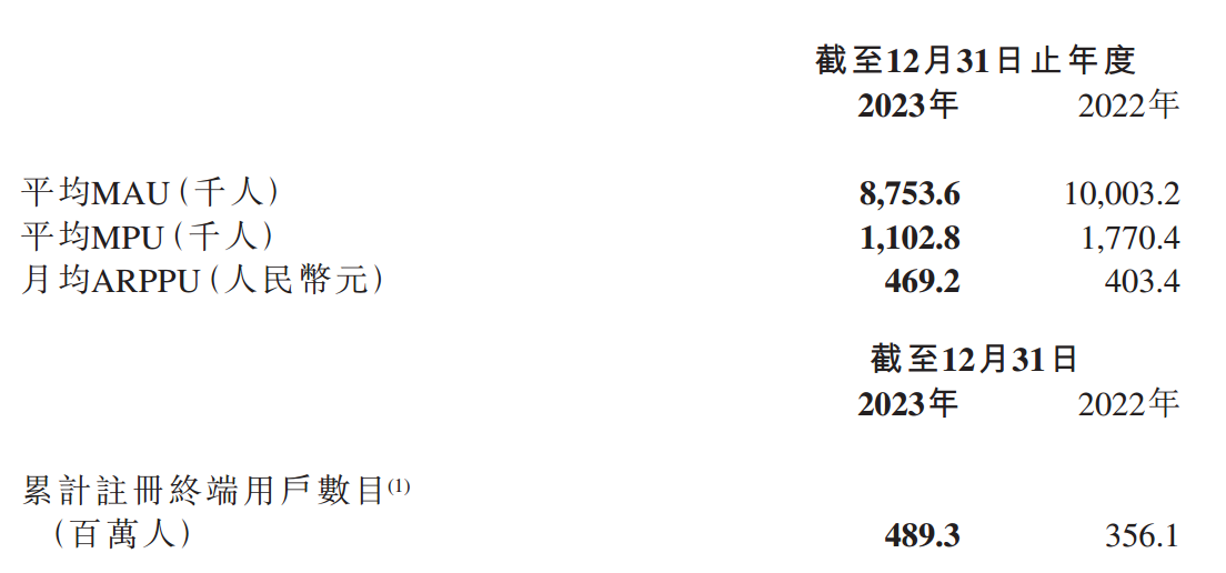 运营数据来看,2023年,中旭未来的平均月活跃用户数(MAU)为875.36万人,2022年为1000.32万人;平均月付费用户(MPU)110.28万人,2022年为177.04万人;每个付费用户的平均收益为469.2元,2022年为403.4元。从上述三项数据看,月活、月付费和平均收益均有所下降,2023年的运营遭遇一定阻力。但是,第四项数据——累计注册终端用户数目,达到4.893亿人,接近5亿关口,远高于2022年的3.561亿人。长周期来看,累计注册用户数的增长,能够持续带动月活、月付费和平均收益的提高,只要该项数据没有重大不良表现,中旭未来的运营潜力仍足够乐观。