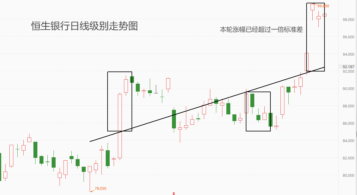 2、上述公告发布后,恒生银行股价在次日跳涨开盘,全天涨幅6.01%,最高触及99.8港元,距离百元关口仅一步之遥。本周截止今日11:35,恒生银行累计涨幅9.42%,股价跳涨之后,连续两个交易日于高位运行,并未出现明显回落倾向。