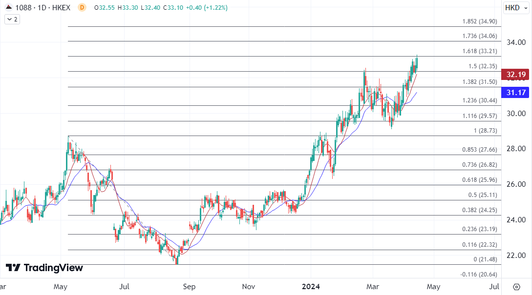 对于投资者而言,高股息的优质港股一直具备长期配置吸引力,“国九条”出炉更是放大了收息股的优势。股息率在7.48%的中国神华(01088)股价今年以来已经235,今日延续昨日的走高,早段上涨逾1%至33港元上方,下一阻力位于34-34.90之间。