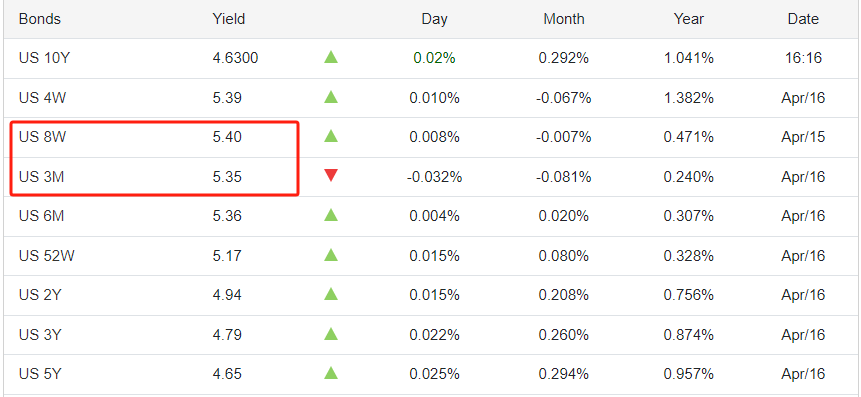 上图为美国债券市场各个周期的债券收益率列表。2023年底到今年初的时候,长短期国债收益率的倒挂临界期为3个月,意味着最早今年3月份美联储就会启动降息操作。然而,随着美国宏观经济数据持续表现强劲,降息预期持续回落,国际市场对美联储最早降息的时间点也不断后移。截至今日,两个月期美债收益率为5.4%,三个月期美债收益率5.35%,两者仅仅相差0.05个百分点,很快就会结束倒挂。果真如此的话,美债倒挂的临界期将从两个月和三个月之间,转变为六个月和一年之间(两者目前的差距为0.19个百分点,短时间内不会结束倒挂),意味着美联储降息的时间点将再次后移至今年10月份。