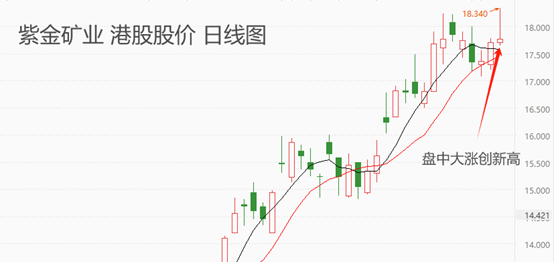 ATFX港股:截至今日上午盘,紫金矿业最高触及18.34港元,创出上市以来新高。不过,从开盘涨至9:50之后,股价急速下跌,至上午盘休市,K线收出长上影,可能意味着推高股价的资金已经出逃。如果全天收盘呈阴K线,则筑顶意味浓厚,后市回落概率较高。如果全天仍以中长的阳K线收盘,意味着新入市资金接力买入,未来涨势可期。