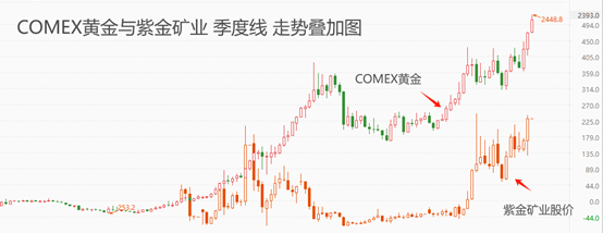 消息面来看,据外媒报道,以色列向伊朗境内一处目标发动袭击,伊拉克、叙利亚南部部分地区和伊朗伊斯法罕省也传出爆炸声。本月13日,伊朗使用无人机,对以色列目标展开打击行动,以色列的袭击可以看做是对该行为的报复。伊朗的打击行动又是对以色列轰炸伊朗驻叙利亚大使馆行为的报复。以色列和伊朗双方各不相让,极有可能导致中东地区紧张局势升温,利多国际金价的同时,对以黄金开采为主要业务的上市公司股价形成支撑。紫金矿业(黄金业务销售收入占报告期内营业收入的 42.09%)今日股价开盘后一小时内大涨,就是基于上述事件影响下的避险情绪提高。将国际金价和紫金矿业的股价进行叠加后发现,两者的涨幅存在较强的相关性。只要国际金价能够维持涨势,紫金矿业大概率能共振性的保持多头趋势。