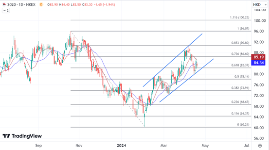 在消费市场的回暖下,更多政策加以支持下,体育用品股可保持继续回暖的势头。安踏首季度零售额已经交出了受欢迎的成绩单,股价当前也在寻求90港元关口的关键突破。不过当前技术上在日图均线遇阻后今早盘中部分回吐,短线可能走低至本周低位再次在80港元处寻找支撑后再次反弹。