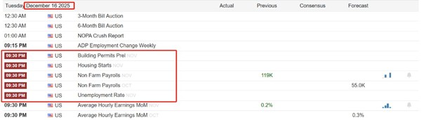美国11月非农就业报告本应在本周五发布,但由于美国政府停摆的影响,发布日期已大幅延后。根据最新消息,美国劳工部劳动统计局将于12月16日21:30公布非农就业报告,该报告不仅包含11月份的劳动力市场状况,还将包含部分10月份的劳动力市场数据。美联储12月利率决议将于12月11日3:00公布,早于10~11月非农就业报告发布时间,预测决议结果的难度较高。有市场认为美联储应该推迟利率决议,在非农数据发布后再做利率决议,目前美联储官方并未对该意见给出回应。