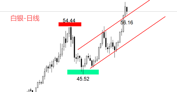 技术角度看,日线级别,白银处于长周期、中周期、短周期的共振性上涨阶段,没有理由对其持看空态度。近期的阶段性高点是54.44,该点位已经被向上突破。近期的阶段性低点是45.52美元 ,可以作为关键支撑位看待。最近一个月,白银日线运行于图中通道线内部,11月28日上破通道上轨,隔日没有进入通道内,形成有效突破。未来可以将通道上轨看作中短期支撑线。