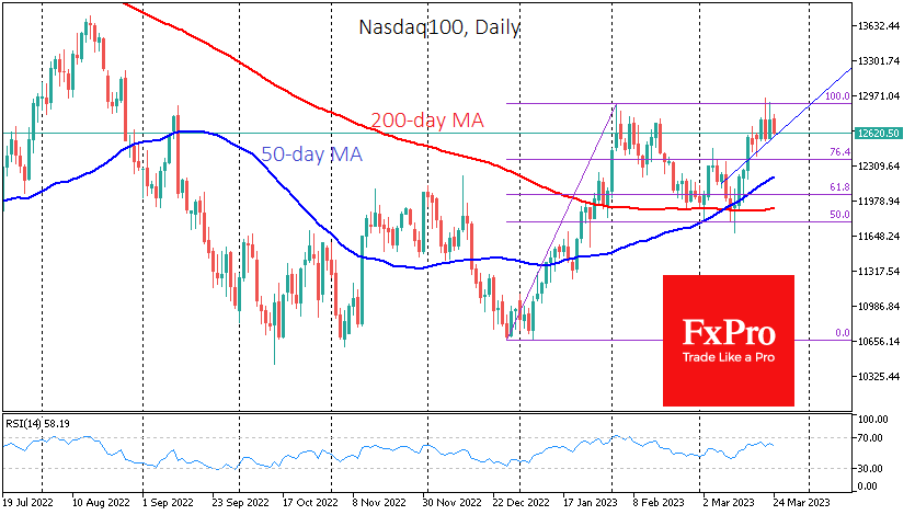 另一方面,纳斯达克100指数因利率前景的变化而反弹,在3月的大部分时间里经历了令人印象深刻的反弹。在过去几天里,市场似乎失去了上行势头,接近13000点和今年的高点,但它仍然保持着积极的偏见。3月初,股指出现了“黄金交叉”,当时50日平均线突破了200日平均线。两条曲线现在都向上。