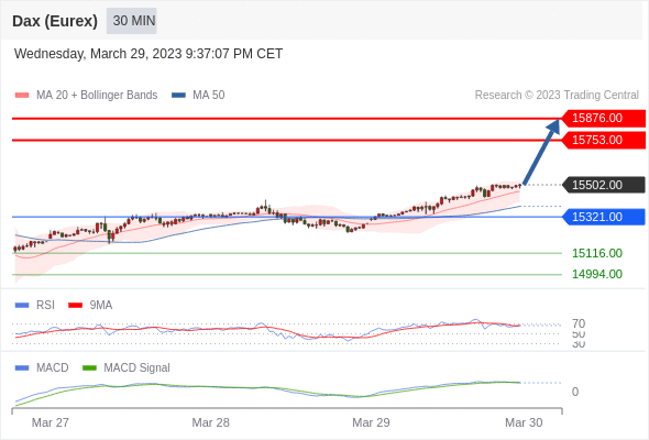 RSI技术指标大于中性区域50。 MACD技术指标呈现看多状态并 处在其信号线的下方。 此外,价位处在其20个时期及50个时期移动平均线上方 ( 当前是 15464.95 和 15380.42 )。