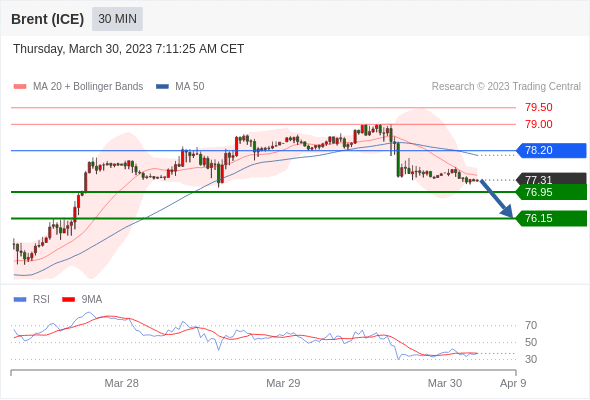 布伦特原油 (ICE)? (M3)? 当日内: 目标位为76.15。