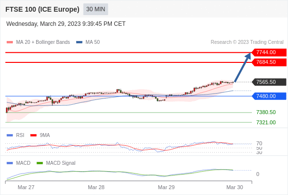 RSI技术指标超过50。 MACD技术指标处在其信号线之下 看多。 此外,价位处在其20个时期及50个时期移动平均线上方 ( 当前是 7553.85 和 7512.97 )。