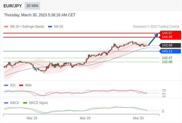 欧元/日元 当日内: 看涨,当 143.12 为支撑位,目标定在144.87。