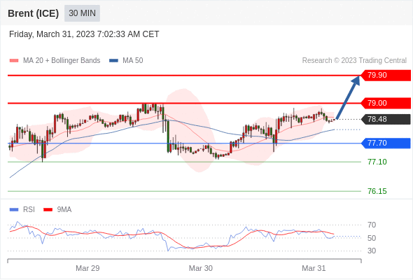 布伦特原油 (ICE)? (M3)? 当日内: 在77.70之上,看涨。