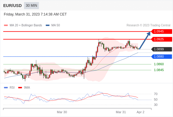 在 1.0880 之上,看涨,目标价位为 1.0925 ,然后为 1.0945 。