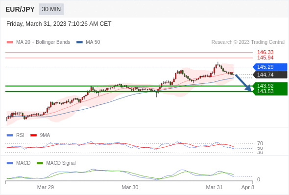 向上突破 145.29 ,将带来继续上行的趋势,目标位定在 145.94 和 146.33 。
