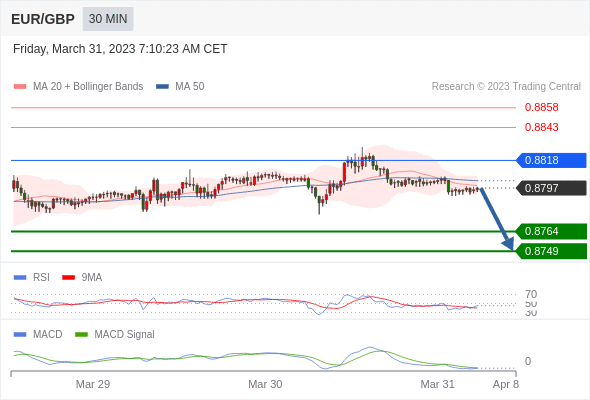 RSI技术指标低于50。 MACD技术指标处在其信号线之下 看空。 此外,价位低于其20天及50天移动平均线 ( 分别位于 0.8799 和 0.8803 )。