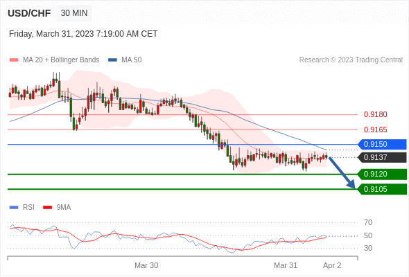 在 0.9150 之下,看跌,目标价位为 0.9120 ,然后为 0.9105 。