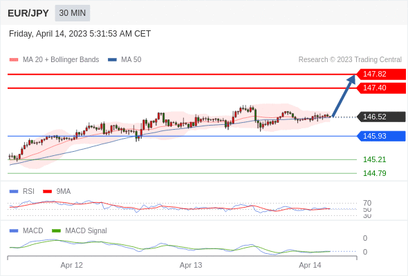 欧元/日元 当日内: 看涨,当 145.93 为支撑位。