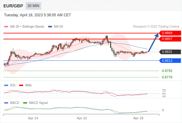 欧元/英镑 当日内: 有上涨的可能,目标价位定在 0.8869 。