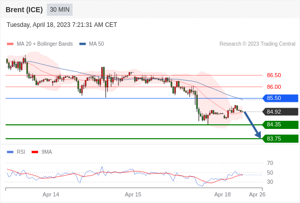 布伦特原油 (ICE)? (M3)? 当日内: 短期关键阻力位在85.50。