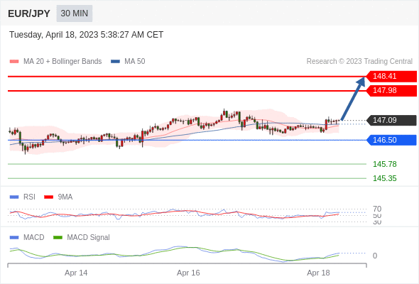 欧元/日元 当日内: 看涨,当 146.50 为支撑位。