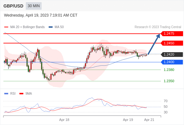 在 1.2400 之上,看涨,目标价位为 1.2450 ,然后为 1.2475 。