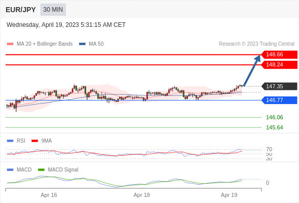 欧元/日元 当日内: 看涨,当 146.77 为支撑位。