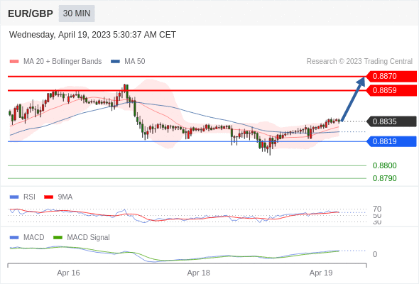 欧元/英镑 当日内: 看涨,当 0.8819 为支撑位。