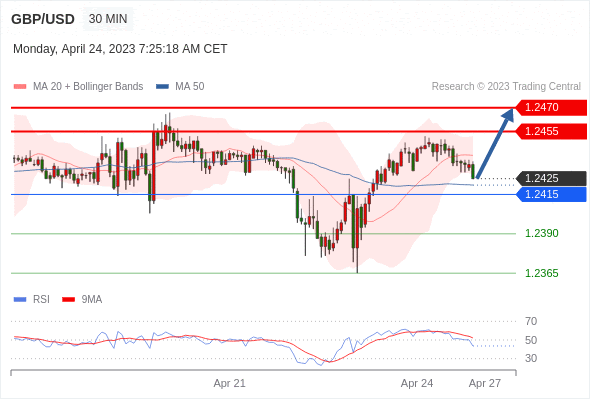 在 1.2415 之上,看涨,目标价位为 1.2455 ,然后为 1.2470 。