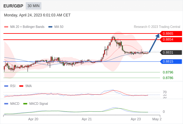 欧元/英镑 当日内: 有上涨的可能,目标价位定在 0.8865 。