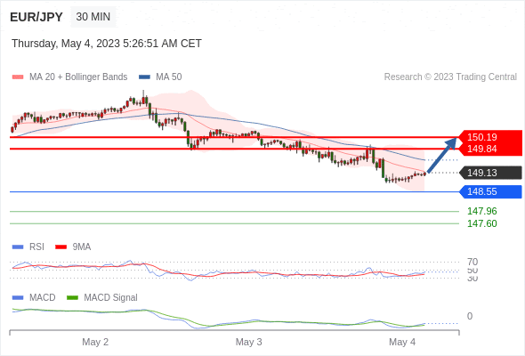 欧元/日元 当日内: 有上涨的可能,目标价位定在 150.19 。
