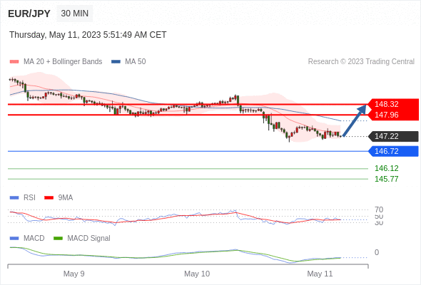 欧元/日元 当日内: 有上涨的可能,目标价位定在 148.32 。