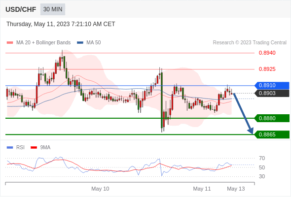 美元/瑞郎 当日内: 短期关键阻力位在0.8910。