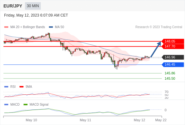 欧元/日元 当日内: 看涨,当 146.45 为支撑位。