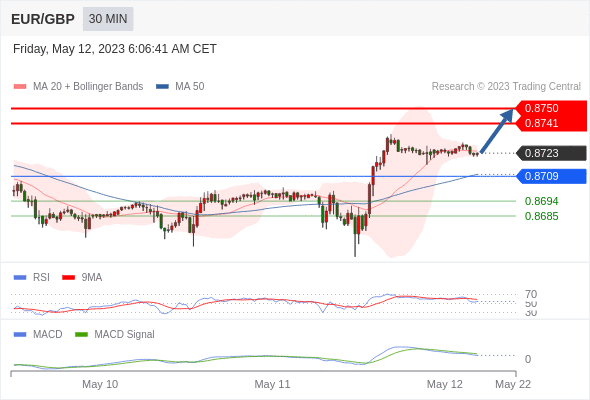 欧元/英镑 当日内: 看涨,当 0.8709 为支撑位,目标定在0.8750。