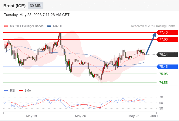 在 75.45 之上,看涨,目标价位为 77.00 ,然后为 77.40 。