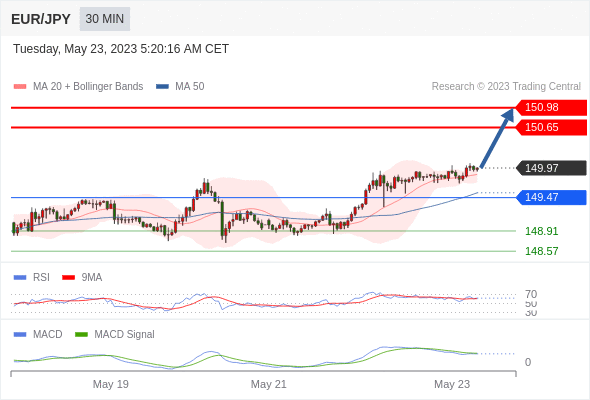 欧元/日元 当日内: 看涨,当 149.47 为支撑位,目标定在150.98。