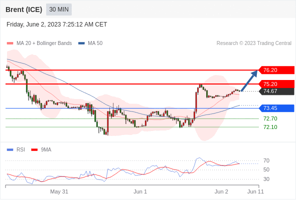 在 73.45 之上,看涨,目标价位为 75.20 ,然后为 76.20 。