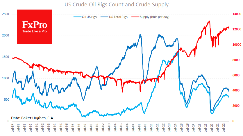 周五发布的每周钻井平台数量数据继续表明,美国油气行业的活跃程度有所下降。总数量(石油+天然气)减少了7台至687台,石油钻井平台数量减少至552台(-4台)。在这两种情况下,这是自2022年4月以来的最低水平。到目前为止,这种下降并没有阻碍产量增长,但它表明行业参与者的谨慎态度,并使石油产量远低于我们在2020年3月看到的1310万桶/天的最大值。