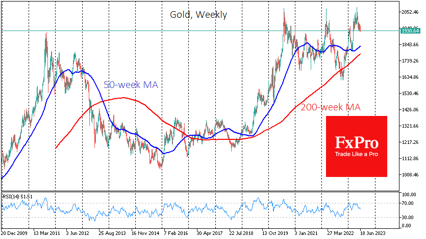 金价反弹至1931美元/盎司,回到了6月份的低点,自3月份以来一直没有持续走低。2018年多年的看涨趋势被去年8 - 11月(全球央行加息最激进的时期)短暂跌破200周移动均线所打断。这条线当前目标是到今年年底达到1860美元。