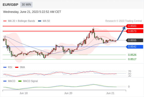 RSI技术指标超过50。 MACD技术指标处在其信号线之下 看空。 此外,价位高于其20天及50天移动平均线 ( 分别位于 0.8554 和 0.8555 )。