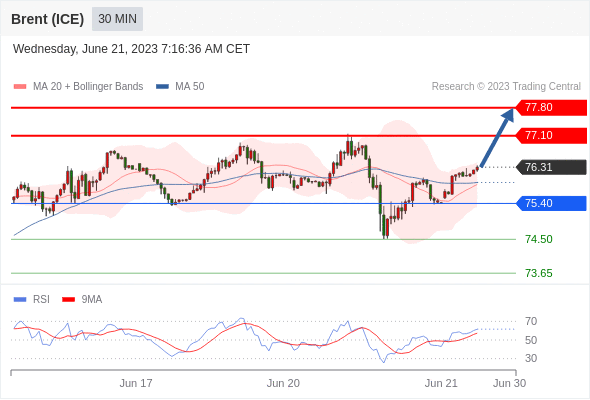 在 75.40 之上,看涨,目标价位为 77.10 ,然后为 77.80 。