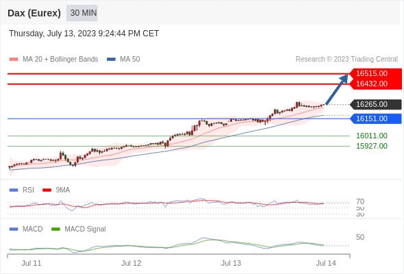 RSI技术指标超过50。 MACD技术指标处在其信号线之下 看多。 此外,价位处在其20个时期及50个时期移动平均线上方 ( 当前是 16241.15 和 16178.36 )。