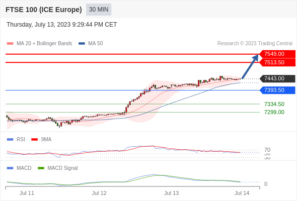 RSI技术指标超过50。 MACD技术指标呈现看多状态并 处在其信号线的下方。 此外,价位高于其20个时期及50个时期移动平均线 ( 分别位于 7441.23 和 7425.66 )。