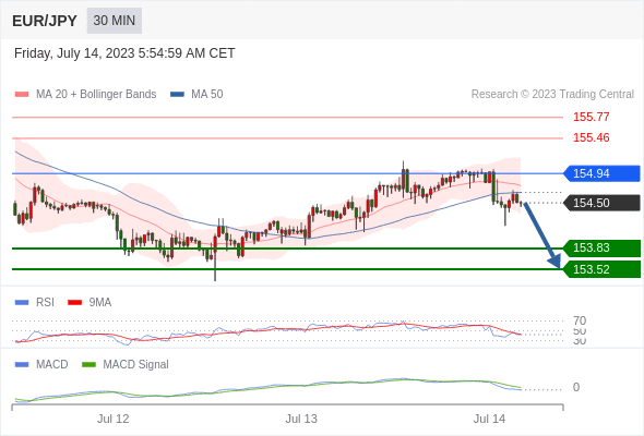 欧元/日元 当日内: 看跌,在 154.94 之下。