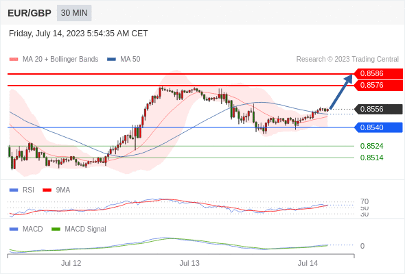 欧元/英镑 当日内: 看涨,当 0.8540 为支撑位。