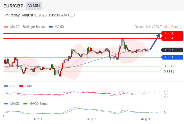 RSI技术指标大于中性区域50。 MACD技术指标呈现看多状态并 处在其信号线的下方。 此外,价位处在其20天及50天移动平均线上方 ( 当前是 0.8604 和 0.8602 )。