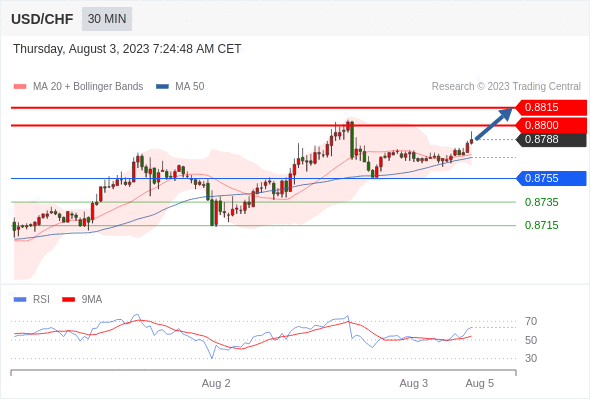 在 0.8755 之上,看涨,目标价位为 0.8800 ,然后为 0.8815 。