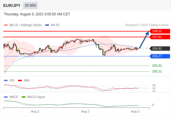 向下跌破 156.27 ,将带来继续下跌的趋势,目标位为 155.61 然后为 155.21 。