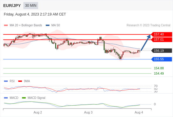 向下跌破 155.55 ,将带来继续下跌的趋势,目标位为 154.88 然后为 154.49 。